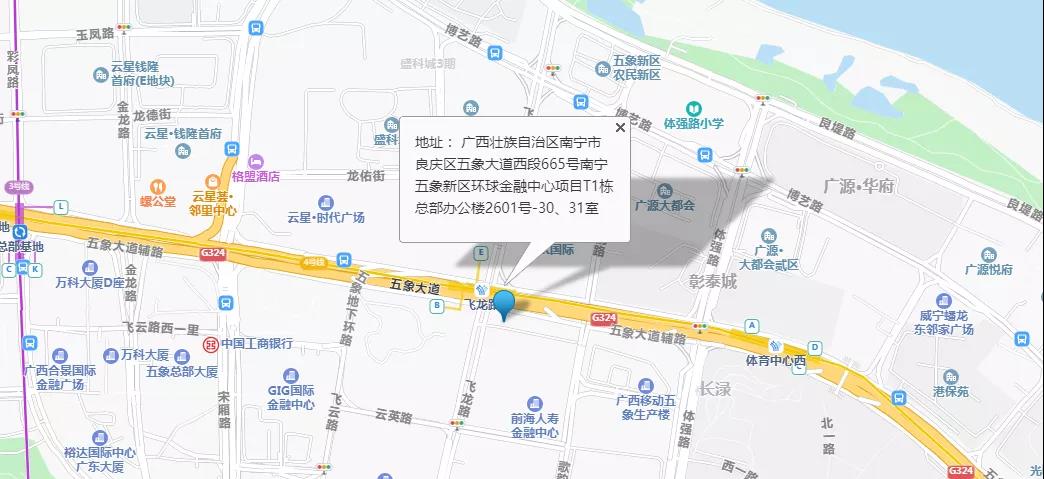 公司地址|廣西壯族自治區南寧市良慶區五象大道西段665號南寧五象新區環球金融中心項目T1棟總部辦公樓2601號-30、31室 |