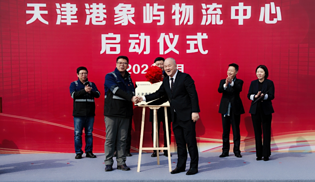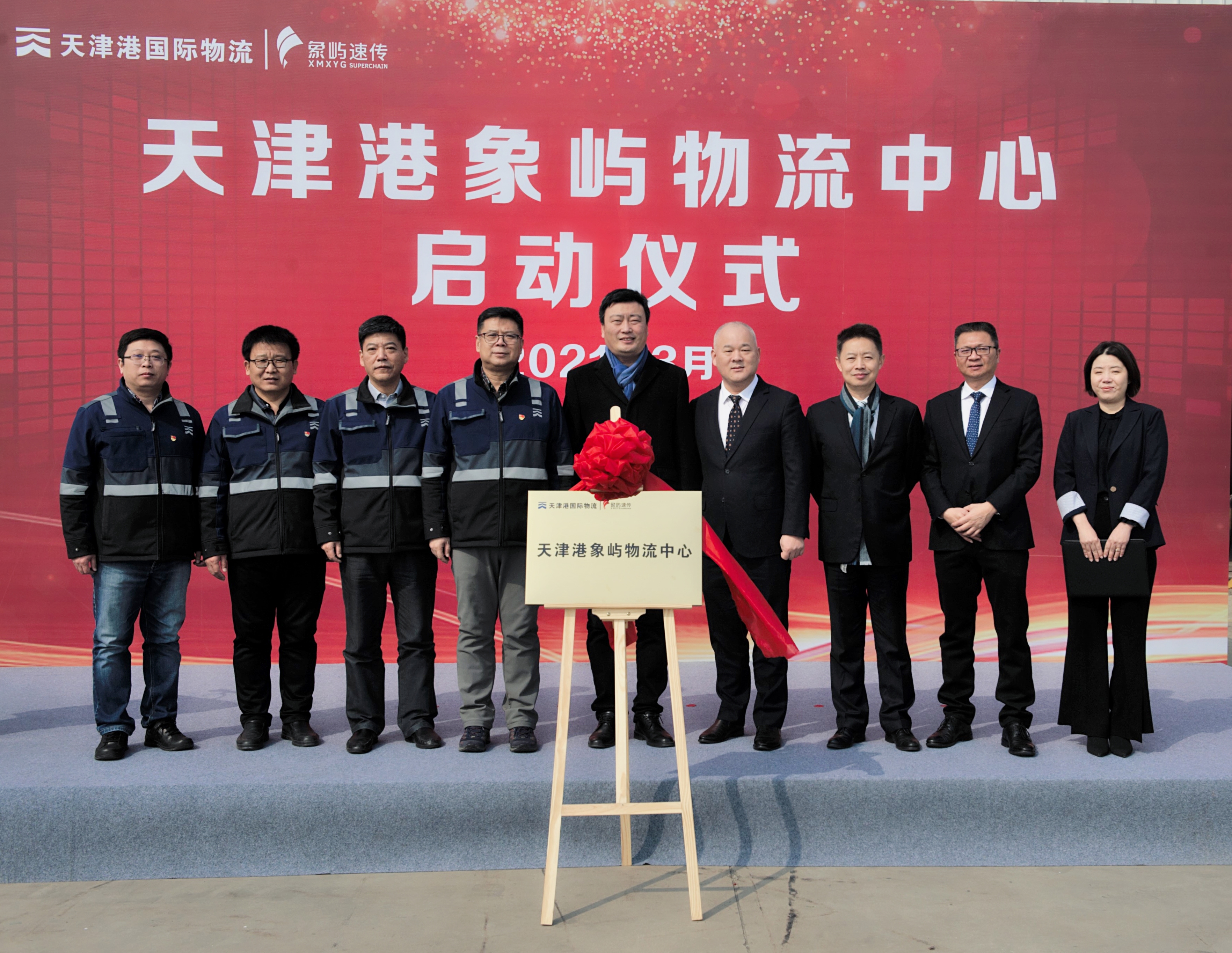 天津港集團業務經營部物流中心主任劉鵬,天津港國際物流黨總支書記、董事長趙明,天津港國際物流黨總支副書記、總經理趙毅,象嶼速傳總經理孫剛,象嶼速傳副總經理胡方等為天津港象嶼物流中心揭牌。