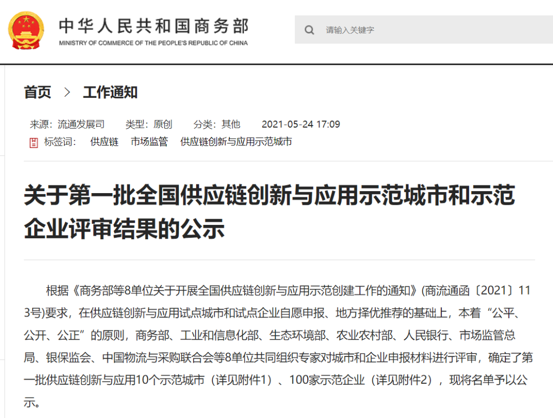 5月24日,商務部公示了第一批全國供應鏈創新與應用示范城市和示范企業評審結果,廈門象嶼(600057.SH)入圍。
