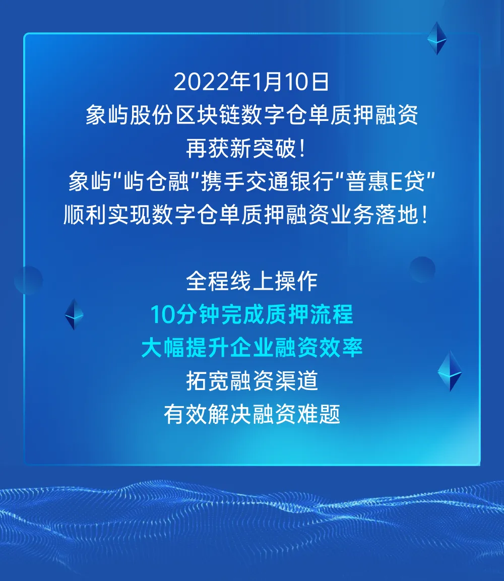 象嶼“嶼倉融”助力交行“普惠E貸”數字倉單質押融資業務成功落地!