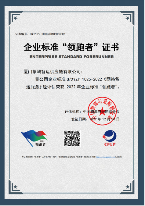 近日,“企業標準領跑者管理信息平臺”正式發布“物流服務”領域首批企業標準“領跑者”企業名單。象嶼股份旗下廈門象嶼智運供應鏈有限公司憑借高水平的網絡貨運服務質量,良好的服務信譽以及扎實的企業管理體系,榮膺首批網絡貨運服務“領跑者”。